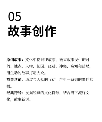 5. 故事创作:从文化中挖掘IP故事,明确故事的时间、地点等要素,用生动故事打动大众;开展故事营销,通过与大众互动,进行事件营销;发掘经典文化符号,结合当下流行文化,对故事进行新的演绎。