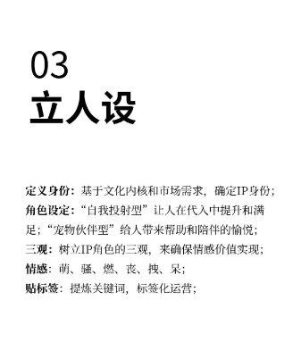 3. 立人设:依据文化内核和市场需求定义IP身份;角色设定有“自我投射型”(让人代入后获得提升与满足)和“宠物伙伴型”(给人带来帮助与陪伴的愉悦感);树立IP的三观以确保情感价值实现;赋予IP萌、燃等情感;提炼关键词,进行标签化运营。