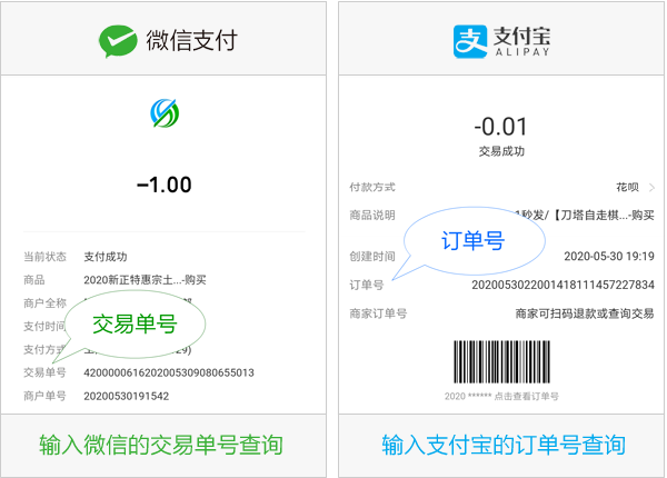 请输入支付宝的交易单号或微信的订单号